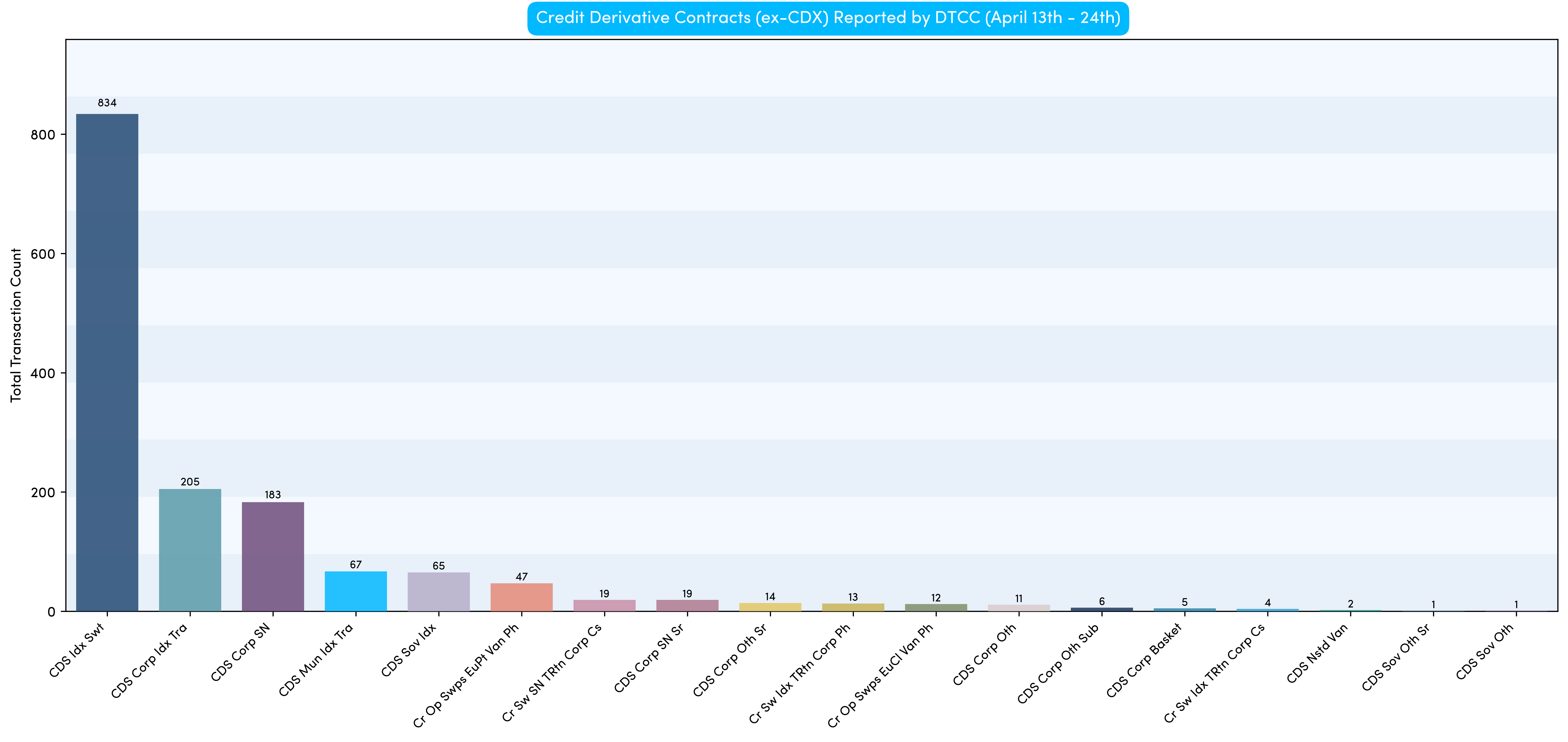 From Chart 1, the first observation is a significant outlier on the left showing ‘CDS Idx Swt’. This refers to Swaption contracts (options on swaps) on CDS indices. The next category ends in ‘Tra’, which is short for tranche and refers to a tranche of a CDS index.