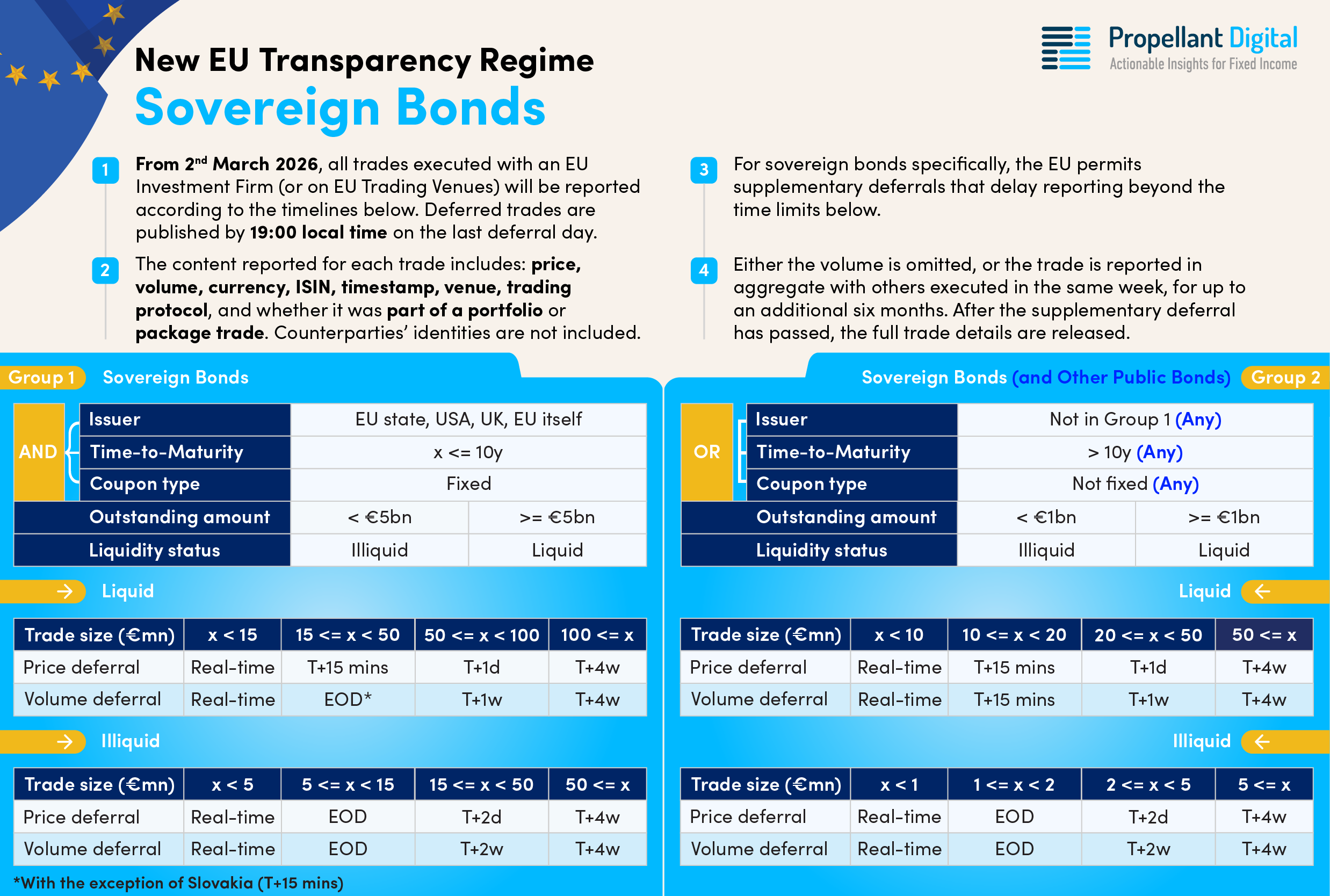 A further important clarification (and only recently confirmed by ESMA) relates to the ability of each National Competent Authority to enforce supplementary deferrals on their own sovereign bonds. The announcement1 clarifies that from 4 May 2026, for sovereign bonds transactions with a size greater than or equal to EUR 15 million and less than 50 million, EU member states will delay the publication of volume until the end of the current trading day. The price will continue to be shown within 15 minutes, and until 4 May 2026, the 15-minute deferral will remain in place for volume (with the exception of Slovakia, which has chosen to keep the 15-minute volume deferral).