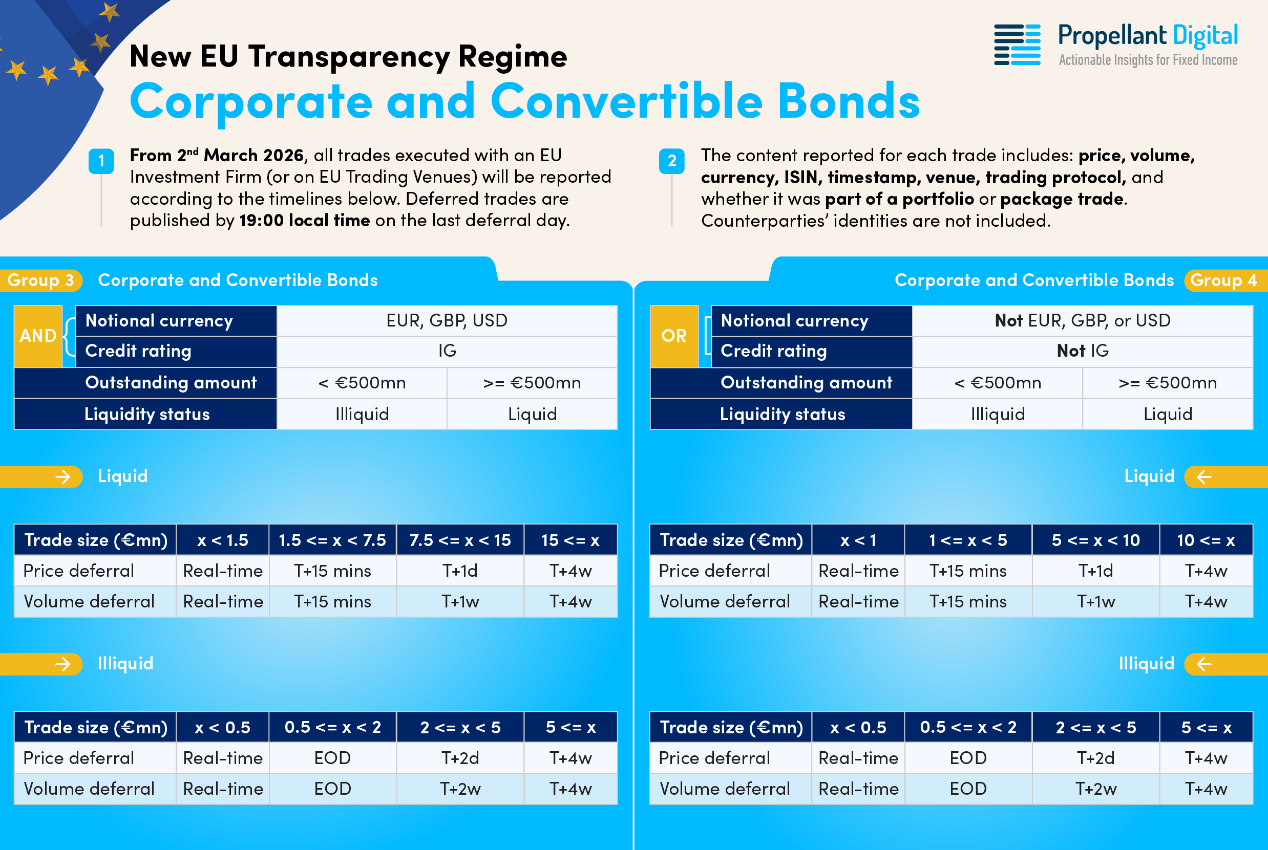 Interestingly, the deferral time frames are actually the same for groups 3 and 4; however, they differ in the trade size required to qualify for a specific deferral. For example, a EUR 7 million trade on a liquid IG (EUR-denominated) corporate would only be deferred for 15 minutes.