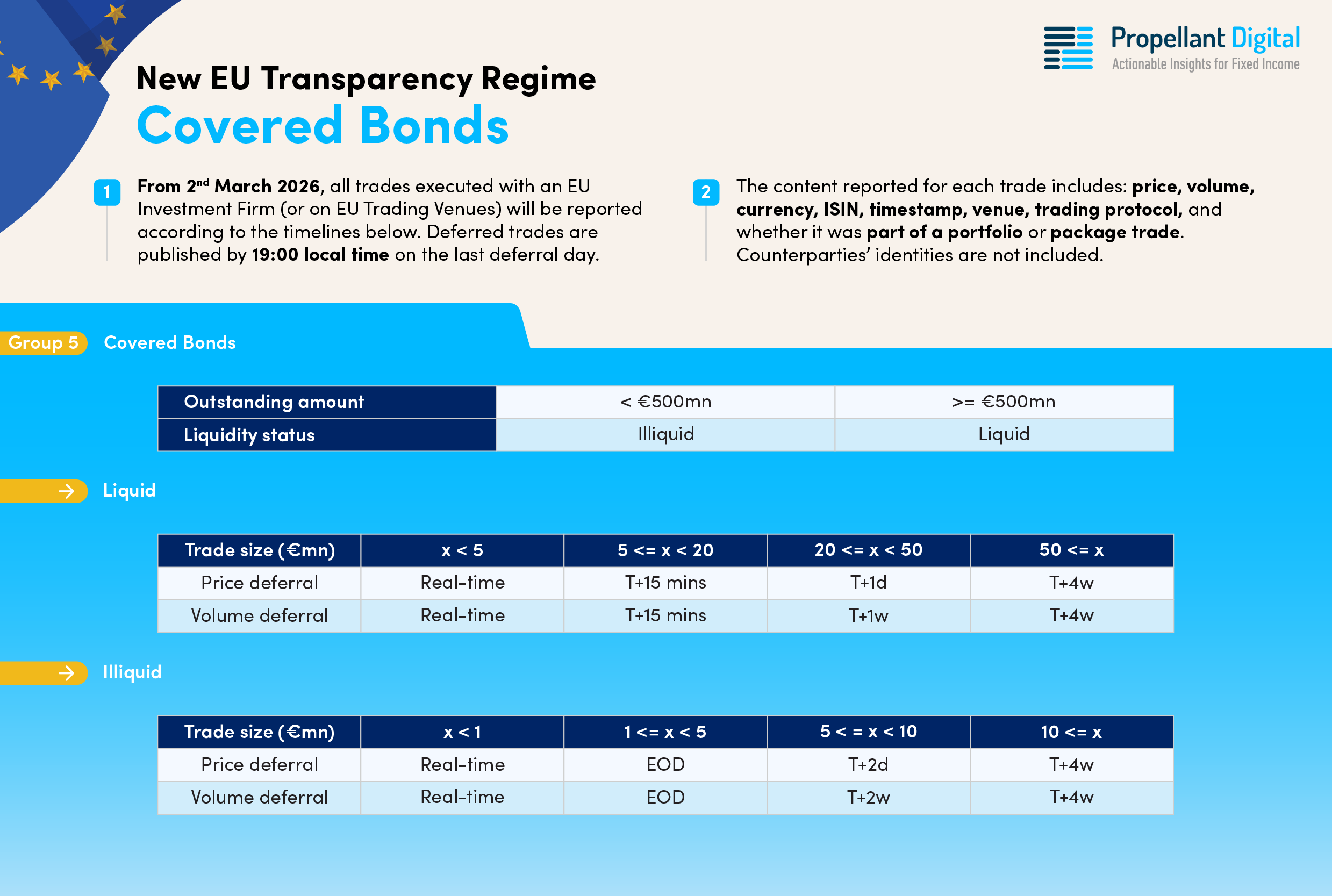 The ESMA regime reflects this, with liquid (again, bonds with an outstanding amount of EUR 500 million or more) issues being reported in real-time up to EUR 5 million, and trades up to EUR 20 million only being delayed by 15 minutes. If the bond is deemed to be illiquid, the real-time and 15-minute deferral cut-offs are 1 and 5 million respectively, which mirror the FCA equivalents (on the assumption a Covered Bond will be IG rated).