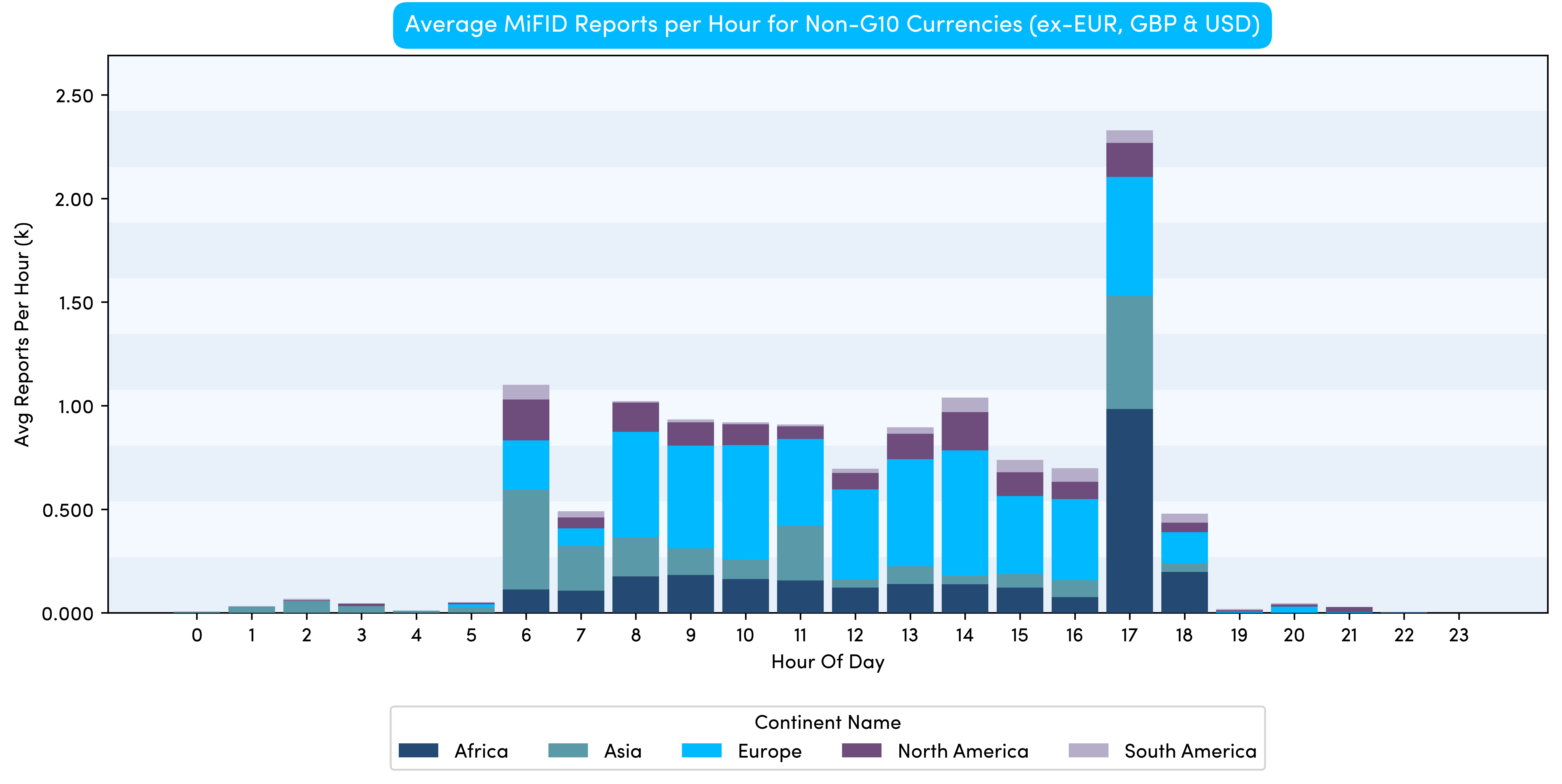 Chart 4 below provides a further breakdown of reporting activity by continent (i.e. the continent associated with each currency). By removing EUR and USD activity in particular, the shape of the distribution has changed noticeably, with the spike at the start of the day disappearing and the spike at the end of the day dominating.