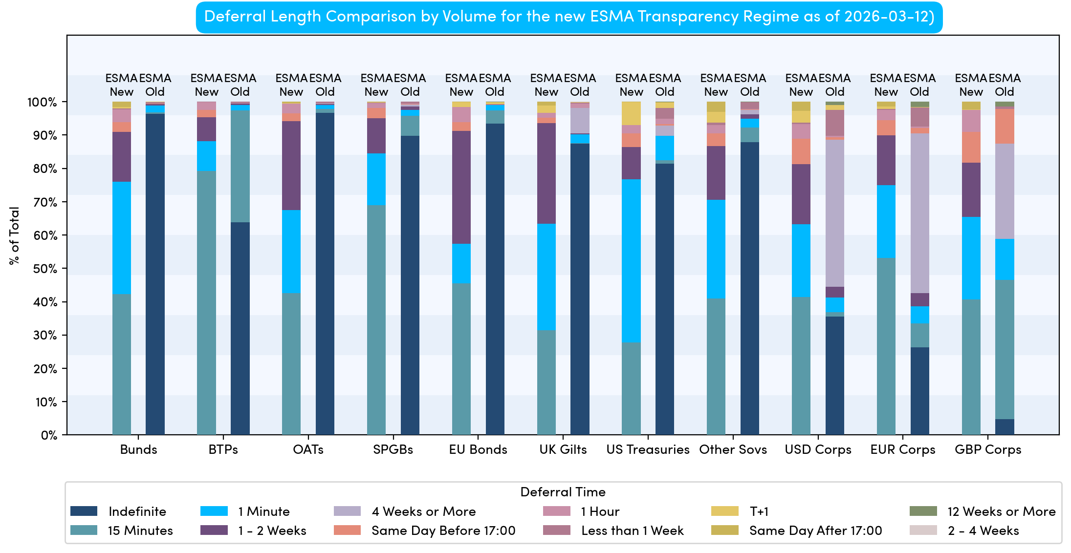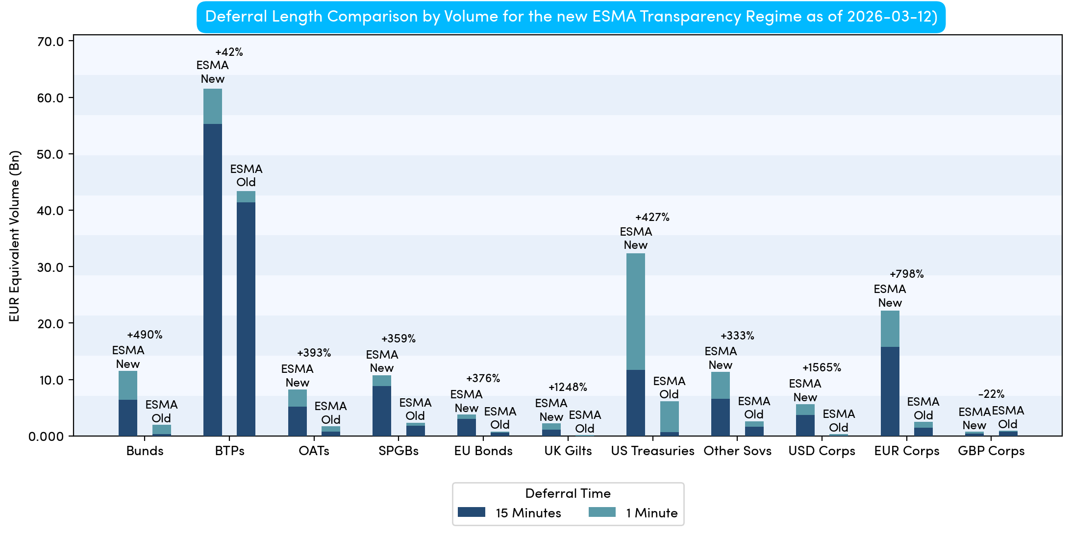 ESMA launched a new transparency regime for bonds on Monday 2 March 2026. Unlike the FCA, ESMA did not change its OTC derivative rules; these will instead be updated in March 2027 .