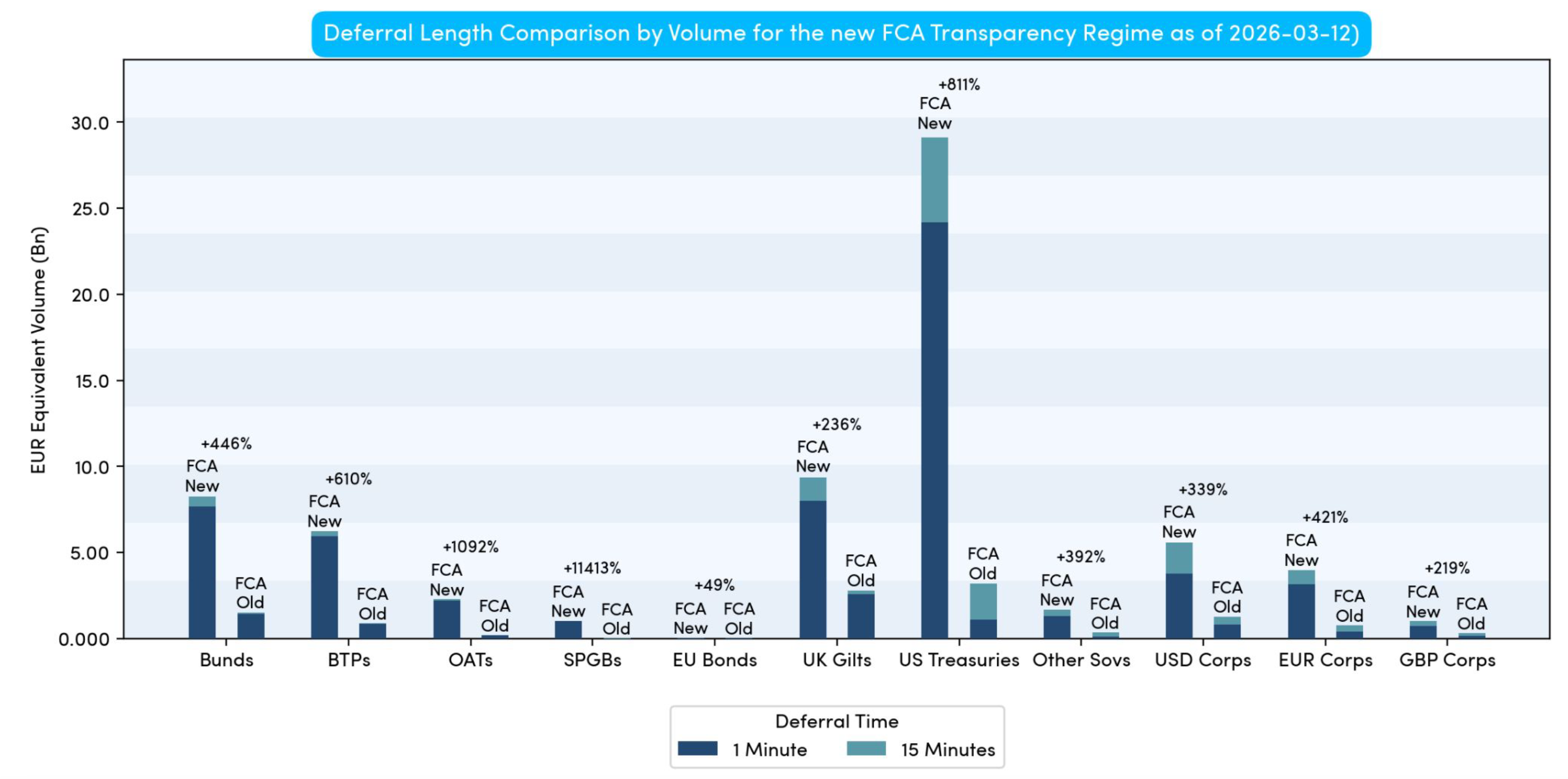 As with the real-time view shown in Chart 1, there is a significant increase in near and real-time reporting across the board. As previously mentioned, the removal of indefinite aggregation (which made up more than 90% of volumes for some sovereign bonds) is arguably the most notable change. This now ensures a transaction level report is provided for every trade (aligning with the new FCA approach), something that may appeal to traders and data scientists alike.