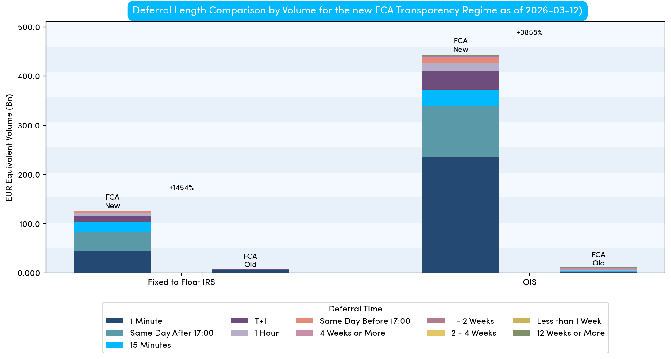 In absolute terms, IRS volumes are vastly higher (with percentage increases in the thousands of percent). This reflects the new rules allowing the reporting of very large notional sizes (up to 2.5 billion of the traded currency on some short-dated contracts).