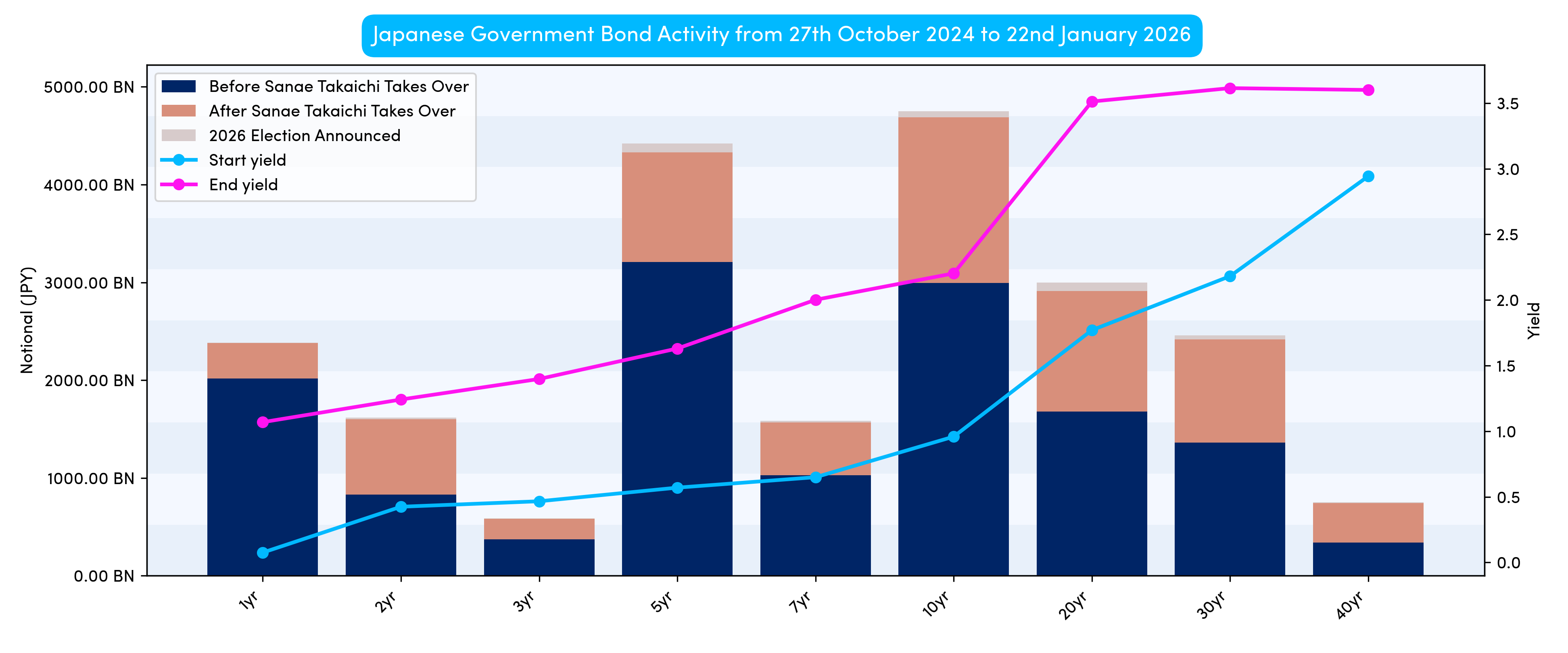 Chart 1 presents the change in yields and reported volumes from October 2024 through to January 2026. Each JGB is assigned to a tenor bucket from 1 to 40 years, after which the volume for each bucket is calculated and the yield overlaid. It is apparent that volumes are roughly proportional to the time period (i.e. it is not obvious that any particular political event led to a dramatic increase in volumes). However, yields have widened dramatically across the curve, in excess of 100 basis points in some cases.