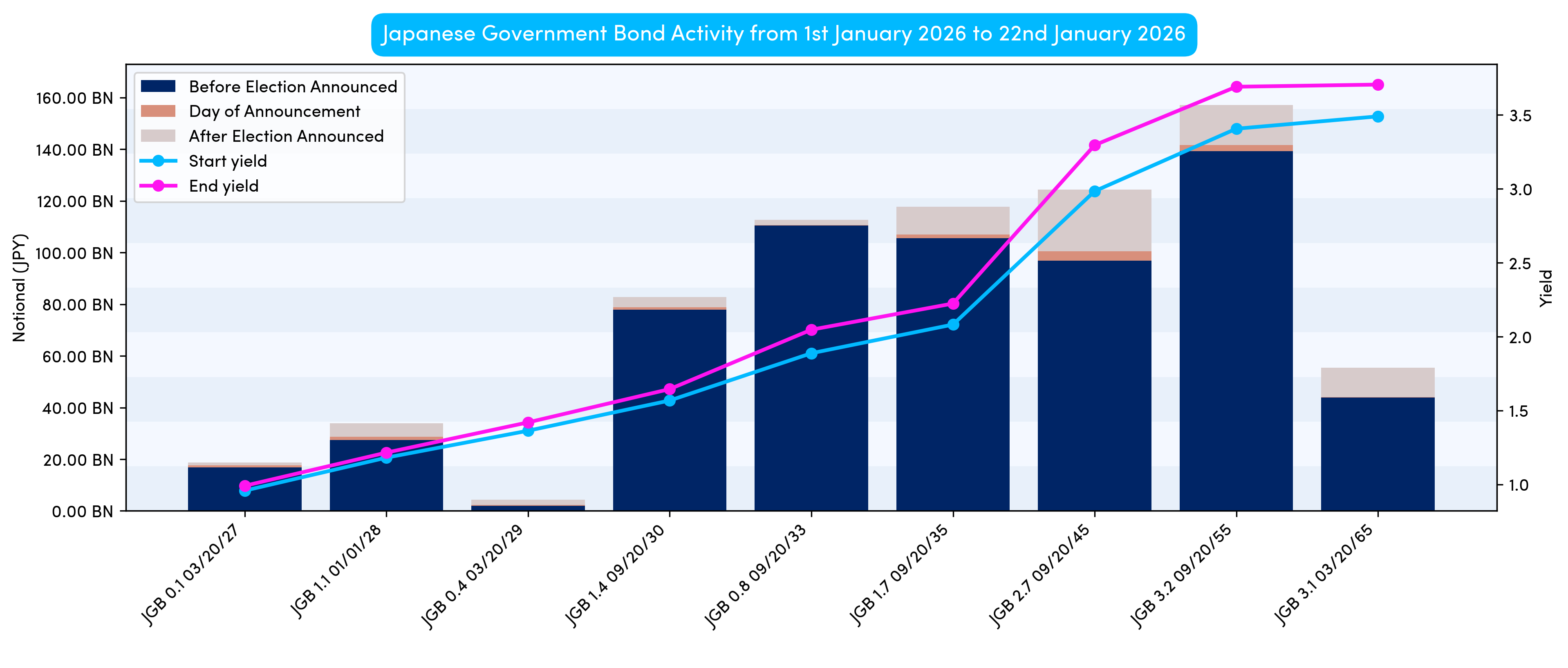 By drilling down to see issue-specific volumes, we can see that activity since the recent election announcement has been proportionally higher at the long end. Additionally, yields have continued to widen, with this being more pronounced at the long end of the curve.
